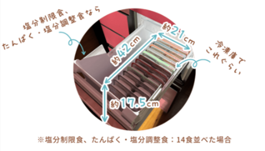 冷凍やわらか食・塩分制限食・バランス健康食はいずれも、縦約17.5cm×横約21cm×高さ約3cm程度のサイズです。ご家庭の冷凍庫のスペースをご確認のうえご注文ください。